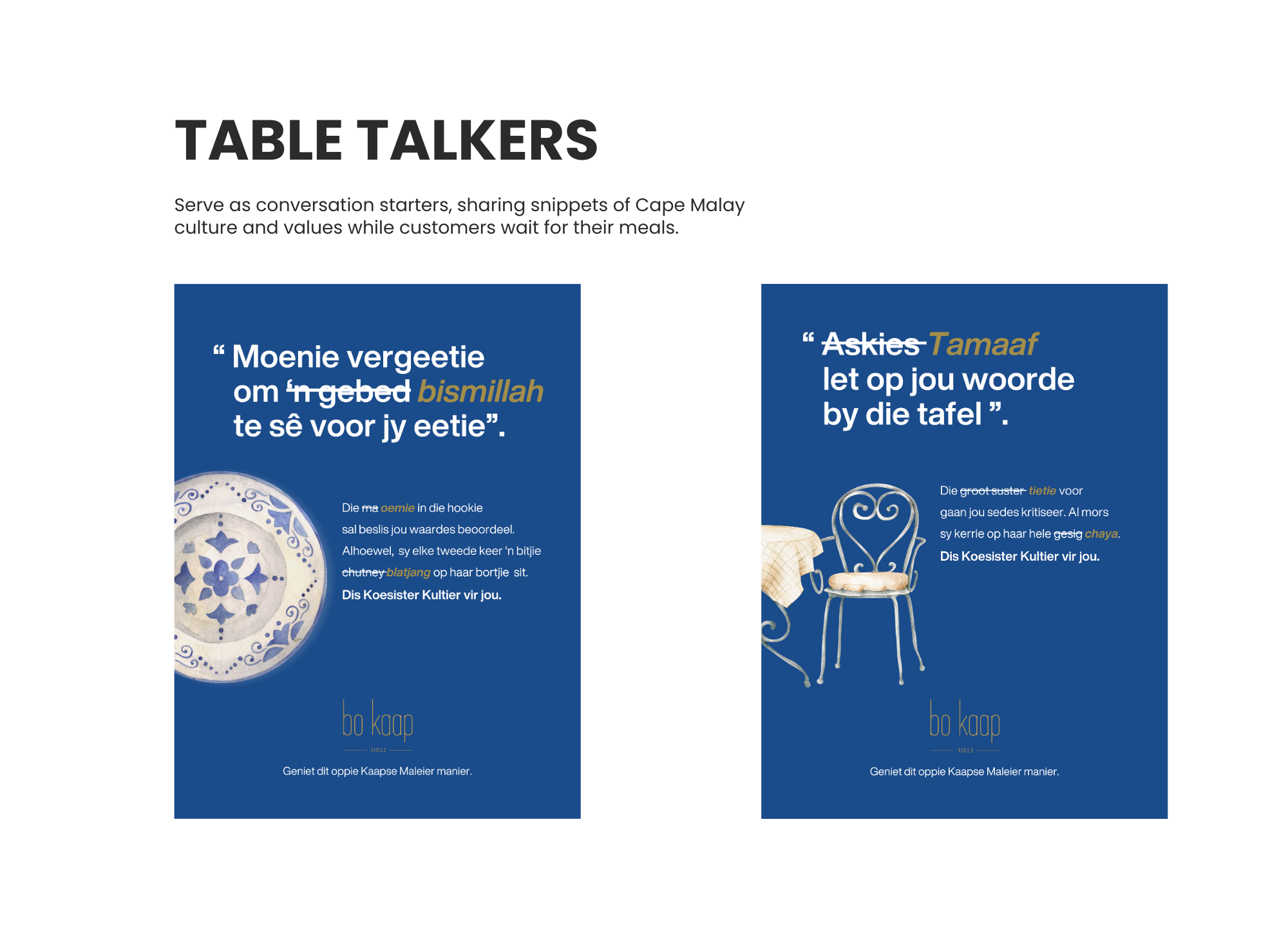 “Koesister Kultier” At the heart of this concept is the ‘Koesister’,a symbol of Cape Malay heritage that represents family unity and togetherness. By embracing Cape Malay customs such as communal dining, vernacular, and table etiquette, the campaign fosters cultural pride and connection.